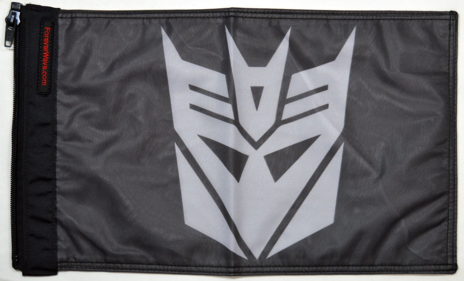 The Transformers Decepticon Flag zips on to any size sleeve. andForever Wave is the only patented interchangeable flag system for Roll Bars, CB Antennas, andLED Whips, andUTV's, Golf Carts, Boats, and More!. The system consists of two parts: the sleeve and the interchangeable flags that attach to it.